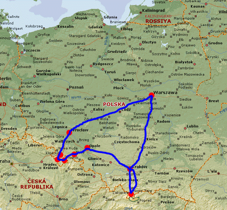Dzien dobry! Meikäläiselle on näköjään tullut tavaksi viettää pääsiäistä katolisissa maissa ei puolilla maailmaa. Toissa vuonna Ecuador, viime vuonna Liettua ja nyt Puola. Eli kävin kymmenen päivän ajan tsekkaamassa Jerzy Dudekin kotimaata, alla pieni raportti kokemuksistani. (Tästäpä nyt tuli turhankin yksityiskohtainen ja pitkä, mutta pakkohan ei ole lukea. :) Kokeilenpa nyt tällaistakin matkajuttumallia sitten.) Ideana oli tehdä yhdistetty treeni- ja lomareissu. Lomailusta todisteet löytyy täältä: http://mikap.iki.fi/ids/index.cgi?mode=album&album=/TRAVELS/poland-2002 ja treeneistä puolestaan täältä: http://rc.eeme.li/polarpics/keem/leirit/puola-2002/ Puola tuntui sopivalta matkakohteelta, koska se oli Valko-Venäjän jälkeen toiseksi läheisin maa jossa en koskaan ollut käynyt. Lisäksi oletin kevään olevan 2-3 viikkoa Suomea pitemmällä, mikä voisi mahdollistaa parempia juoksukelejä. Kävipä kuitenkin niin, että alkupuolisko vastasi olosuhteiltaan Suomen maaliskuuta ja jälkipuolisko sitten toukokuuta, joten odottamani huhtikuun kelit jäivät kokonaan väliin. Alun perin olin ajatellut poiketa Ukrainan Lviviinkin pariksi päiväksi, mutta enpä sitten jaksanut alkaa säätää viisumin kanssa ja olisipa se aiheuttanut aika lailla lisäkilometrejäkin matkaohjelmaan ja siten generoinut turhan kiireisen aikataulun. Vaihtelevasta ilmasta huolimatta Puola oli erinomainen matkakohde! Hintataso ei ole vielä noussut länsimaisiin mittoihin, mutta laatu jo aika lähelle. Eli Puolassa on helppo ja mukava matkustaa, mutta rahaa kuluu hyvinkin kohtuullisessa määrin. Toki eksymisiäkin sattui, niistä lisää tuonnempana. Aloitin lentämällä Varsovaan lauantai-aamuna 23.3. ja sieltä edelleen yöjunalla Sleesiaan ja Wroclawiin. Tästä eteenpäin reitti meni suurin piirtein: Klodzko, Kudawa Zdrój, Miedzygórze, Nysa, Opole, Zakopane, Krakova, Varsova. Paluulento oli sitten aprillipäivänä. Karkea reittikartta näyttää tältä: