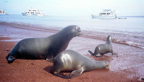 Galápagoksen merileijonia, uros ja pari naarasta